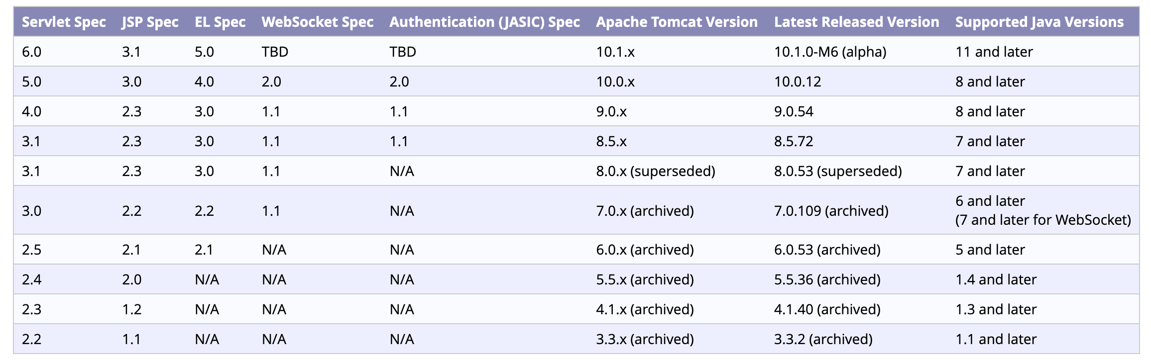 -> 사용할 톰캣이 다양한 스펙들을 지원하는 버전을 확인할 수 있습니다.