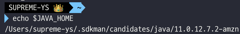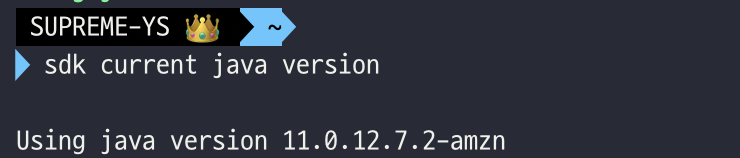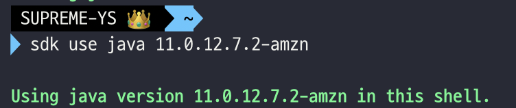 - $ sdk use java 11.0.12.7.2-amzn 명령어로 자바 버전을 사용하겠다고 선언해줍니다.