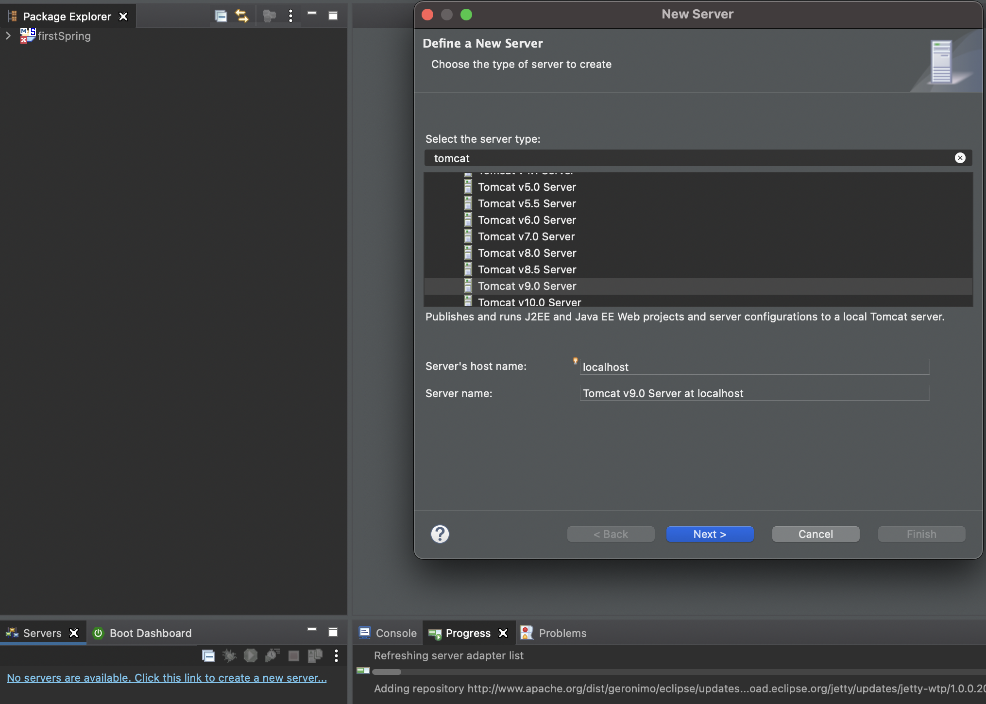 - STS 창 왼쪽 하단아 Servers 창에서 No servers are available 클릭 후, Tomcat 검색