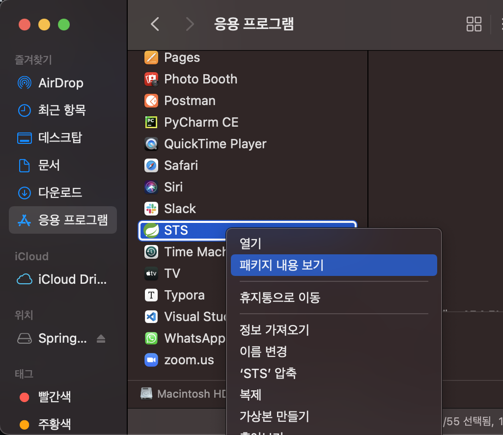 - 응용 프로그램내에 STS파일을 우클릭 후 '패키지 내용 보기'를 클릭합니다.