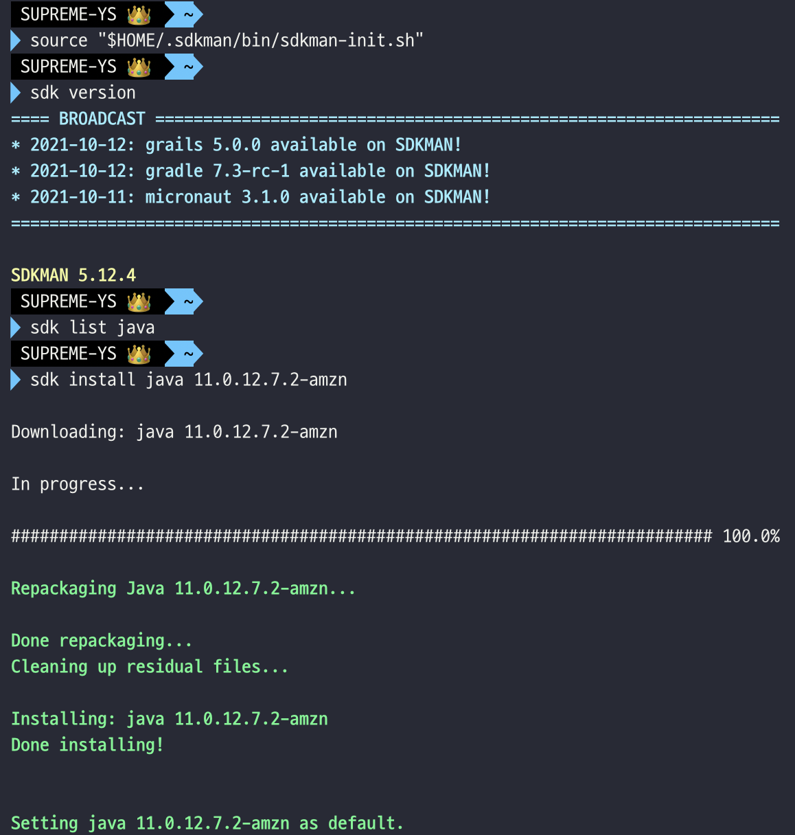 $ sdk install java 11.0.12.7.2-amzn <--- 지정된 JDK설치(원하는 종류와 버전 지정)