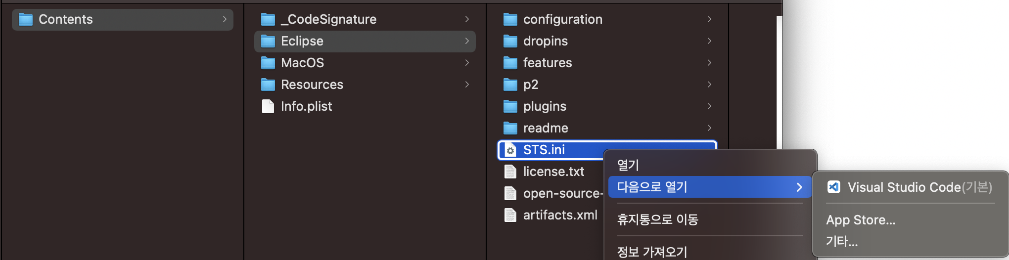 - 이후 아래의 그림과 같이 Contents -> Eclipse -> STS.ini 파일을 우클릭 -> VS code로 열기를 클릭합니다.