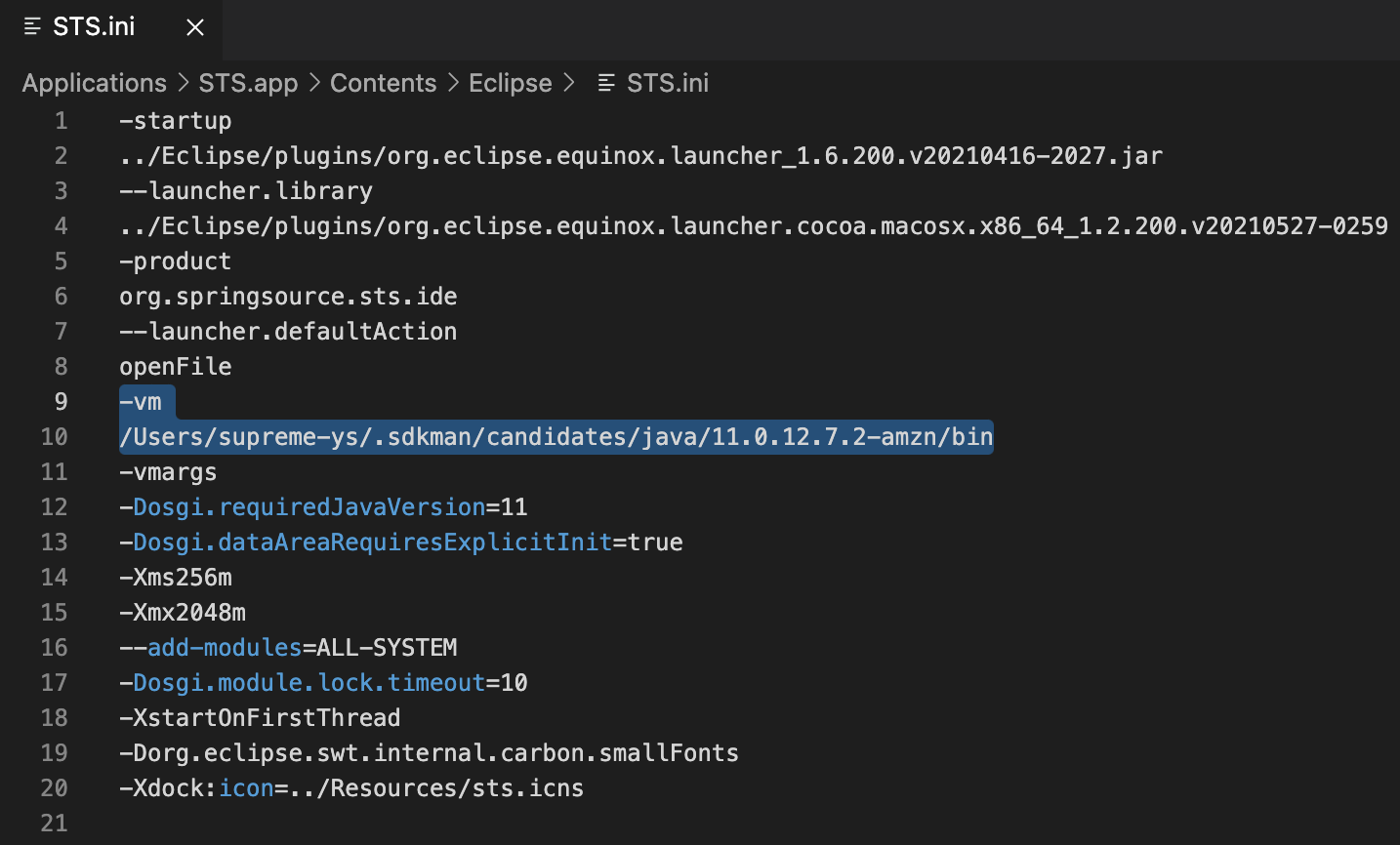 - 추가 설정이 필요한 부분입니다. 아래 그림의 STS.ini 파일에서 코드의 9번째 줄과 10번째 줄에 -vm과 자바가 설치된 경로/bin 을 추가한 후 파일을 저장해줍니다.